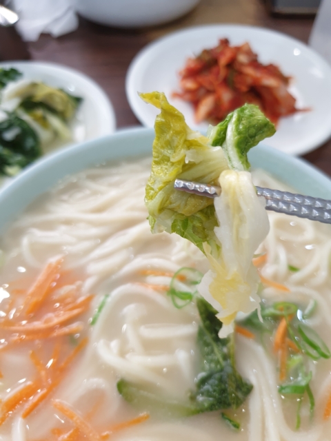 당근과 대파 고명을 휘젓고 이제는 면을 먹어본다. 면은 평범한 기계식 국수로 별다른 감흥은 느껴지지 않는다. 명동교자처럼 얄디얇은 면은 아니나 너무 넓지도 굵지도 않은 딱 중간맛을 지키고 있는듯한 느낌이었다. 맛있는 국물을 잘 머금은건 아니어서 백김치나 겉절이를 곁들여서 먹는 것을 추천한다. 나는 약간 슴슴한 느낌이었다.